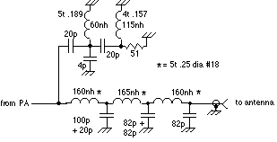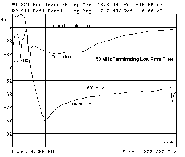 Floor limit in this case due to enclosure cross talk. Shielding or compartments will push the floor much farther down, >-100dbc. N connectors are recommended for sustaining the good return loss of the filter. The 3 pf capacitor can be tweeked to improve the higher frequency return loss if desired. The design values include 4 nH of inductance for the dipped mica capacitors. The hi pass filter coils are #24 gauge buss wire wound on drills for size. Keep all leads short and make sure there is a good ground sheet for the return of all RF currents throughout the entire enclosure. The enclosure should also have good tight covers to prevent leaks. The low pass filter is tuned by bending the 5 turn coils. No capacitor tuning is necessary nor desired.
