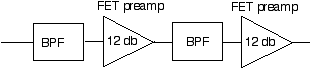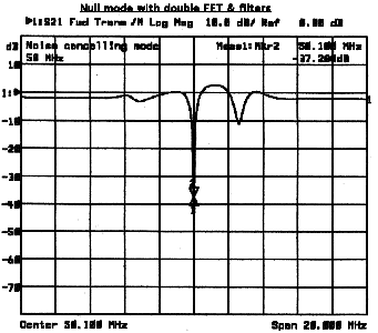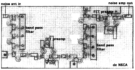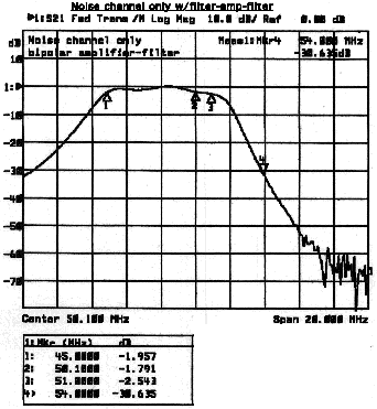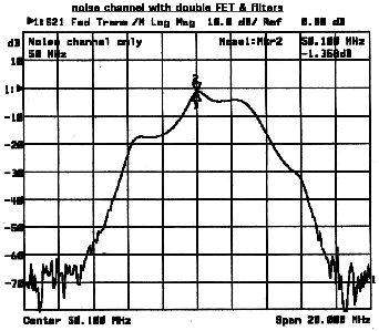 Now the filter-bipolar-filter noise channel only. There is still adequate filtering out of band to prevent problems. Even the bottom end of channel 2 has 30 db of attenuation. This same front end is now in use for the front end of the new six meter transverter. There has been no interference with it.