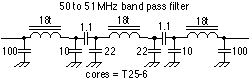 We need to filter the noise channel since we don't want to bring in any extra signals. After all we are amplifying and injecting them into the receiver so filtering is important. Below is a 3 pole band pass filter which covers 45 to 51 MHz. It is used not only as a noise front end filter but for MUF and main receiver filtering as well.