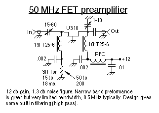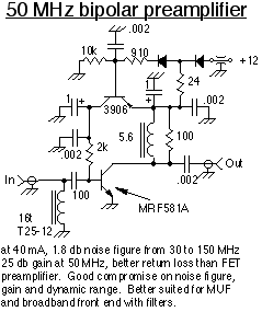 The bipolar is a new design primarily since I have started monitoring for six meter MUF indicators as low as 45 MHz. I needed a high dynamic range, low noise figure preamplifier which would cover the entire band (43 thru 51 Mhz) and the FET preamplifiers won't do that. They both provide about the same amount of gain however.
