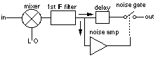 Noise pulses (ignition and power line) pass through the mixer and 1st I.F. filter and are split into two channels: one to the noise amplifier and the other to the delay line and the noise gate (an on & off switch). The output of the switch goes to the rest of the receiver. Noise pulses are amplified greatly by the noise amplifier and are then used to turn the noise gate on and off. This is the same as turning the receiver on & off but very fast so you never hear it. When a noise pulse enters the receiver the noise gate "opens up" and "blanks" or turns the receiver off until the pulse has passed. This gate turns on & off in a few dozen nano seconds.