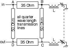 We need to control the phase with very fine resolution while maintaining a constant 50 Ohm impedance in order to get good cancellation. The following circuit is an adaptation of a microwave idea which has been around for a long time. A 90 degree quadrature hybrid has some interesting properties: as long as the two original outputs (B and C) have the same load impedance then the input (A) and output (D) impedances remain good. That means we can place two identical (tracking) loads on B and C and control the phase without hurting the impedance of the hybrid. It also has very low insertion loss. It is essentially a lumped component version of quarter wavelength transmission lines.