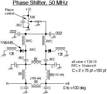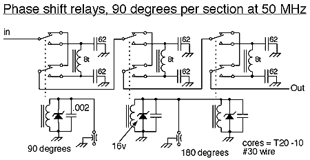 Since the 0 to 100 degree phase control isn't adequate to give complete phase coverage, (360 degrees needed) a two stage 90 degree and 180 degree fixed shift was also used. These are essentially 50 Ohm quarter wave length lines simulated with lumped components again and are switched in and out with relays.