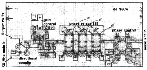 The combined signal then goes to the 50 MHz receiver or transverter. Care must be taken to not run too much gain from the noise channel as it is very easy to inject unwanted signals and noise. When first using this device it is wise to practice on carriers as they are usually stable. Trying to null a ssb signal is virtually impossible. To disable operation merely remove DC power to the noise channel amplifier. Changing the phase from "null" to "addition" (180 degrees) will add noise to the main receiver and the gain will have to be reduced. It's easiest to remove DC power. Insertion loss to the noise channel is about 2 db (attenuator) + 12 db (directional coupler). The 50 main attenuation is about 1 db.