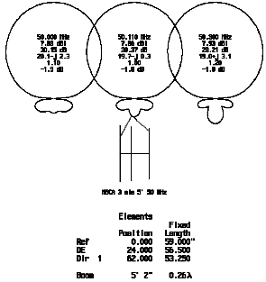 Below is a super clean noise antenna which has virtually no side lobes. It is designed using "YO", Yagi Optimizer by Brian Beezley K6STI. It has low gain since gain is not needed to hear the offending noise and a clean pattern to minimize picking up unwanted signals. It would be ideal to have the exact same beam width as the main antenna but that would mean we need the same boom length as the main antenna. What we really need is an antenna with a 1 degree beam width and no gain all on a one foot boom for 50 MHz! This is a compromise of course.