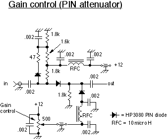 The variable gain adjustment is provided by a PI type PIN diode attenuator. While more precision resistors are called for this version works quite well. It also have very high dynamic range so it can handle very strong signals without intermodulation products. It has slightly less than 2 db of insertion loss and has better than 35 db of gain control while maintaining close to a 50 Ohm impedance.