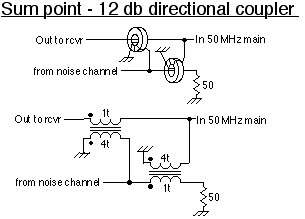 We can't tolerate much insertion loss at the summing point since the main 50 MHz signal is present and we don't want to attenuate it very much. A directional coupler was chosen since it can very low loss to the main thru put. The insertion loss of the coupled port 10 to 20 db can then be compensated for by the gain of the noise amplifier gain. A reasonable compromise can be achieved with a 12 db coupler. It is fabricated using high permeability toroids and is simple to fabricate.