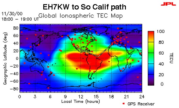 Normal beam heading for Jose, EH7KW (EA7KW) is 310 but he was pointing at 240 degrees. Normal beam heading for Southern California to Spain is 44 degrees but we were pointing 90 degrees. Path appears to be single hop F2 2800 miles (4500 km) for Jose and double hop F2 5000 miles (8000 KM) for Southern California. This path has been run by Jose many times in the past and he has had great success working into the southwest United States by this means. Interestingly enough the path only occurs when the A and Kp indices are low, similar to long path conditions. Observations of the total electron count (TEC) map suggests the northern boundry of the higher TEC area is the location of the scatter/reflection point. Some previous observations of the TEC maps have shown that propagation exists between stations located on the higher count boundries. One more piece of the six meter puzzle.