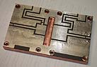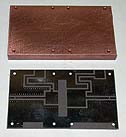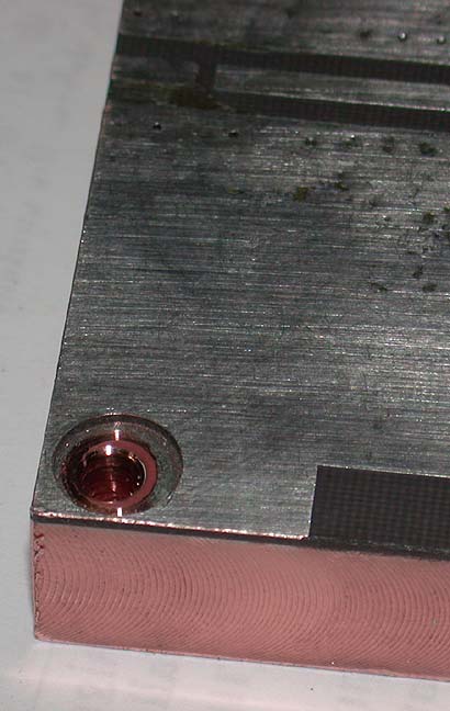 below: Copper block, 1/2 inch X 3 inch bar stock, rough cut to start with. Holes are tapped to allow easy attachment of PC board to block while soldering in place.