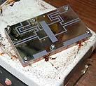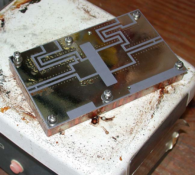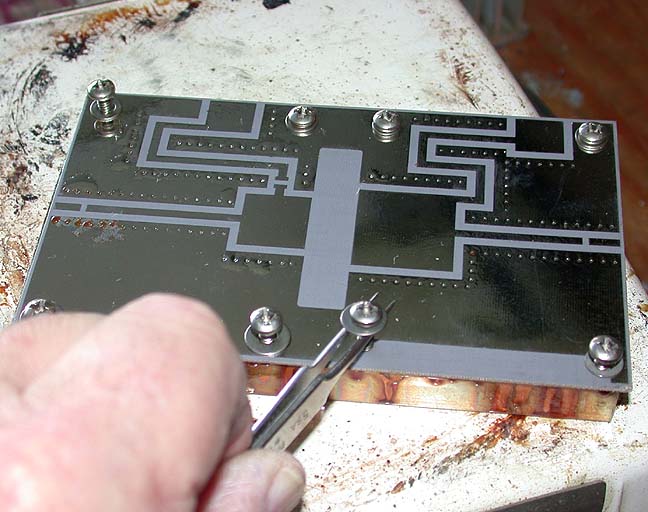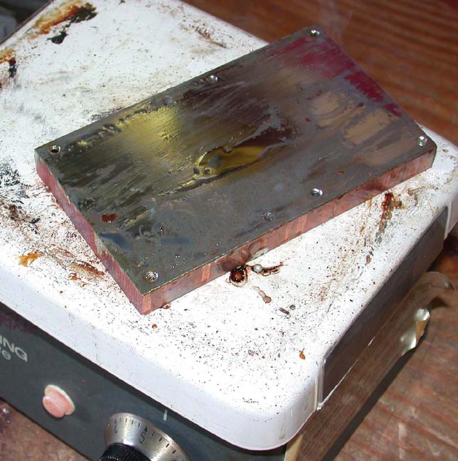 below: Place PC board on hot Copper block, (resist the temptation to grab the block) Insert stainless steel screws screws with tweezers (stainless steel) using large flat washers under screw heads.