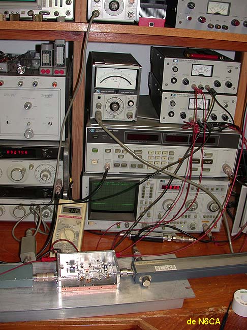 In this case I started out at 100 milliwatts of drive. This transistor is supposed to have about 17 db gain. That's an amplification of 50 times; 0.1 watt X 50 = 5 watts so no matter what, I should be OK. The entire test setup is assembled, all power supplies are set in voltage and proven with an external meter, current linits are set and proven with an external calibrated current meter ( when was the last time you proved your current meter is calibrated?). When all is set and ready to go, prove your drive level and complete RF set up by bypassing the UUT (Unit Under Test) with a coax adapter(s). The output power meter should give you the correct drive level and will verify that everything is hooked up correctly including the spectrum analyzer. If there are any low frequency oscillations, they will modulate the output signal of the amplifier and you can easily see them. Then reset all meters to the correct range for the increased levels from the UUT. Inserting the UUT will then be in a controlled setup. Apply DC voltages to the amplifier without RF drive and set the idling current. No should be no indications on the spectrum analyzer nor power meters. If there is then you probably some sort of instability. The spectrum analyzer will show you what's going on.