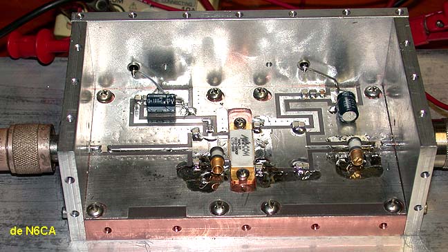 to establish excellent ground returns for the entire board by soldering it completely to the Copper block. Using screws alone will NOT establish good enough ground returns for the transistor, the matching components and the in and output connectors. Don't try any short cuts here as it will only give you mucho headaches!