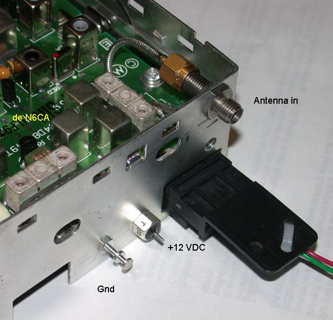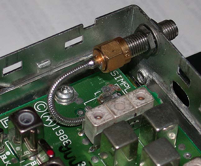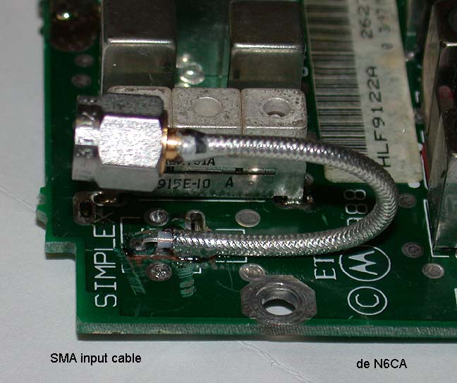 The original gray cable was discarded and replaced with flex UT-85 coax. It was hard soldered to the board after the solder mask was removed. This provides to good RF interface. The SMA connector attaches to the SMA female feed-thru connector nounted on the rear panel.