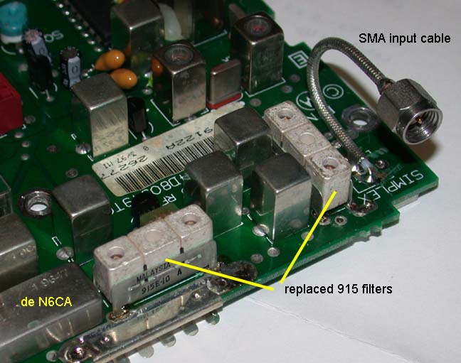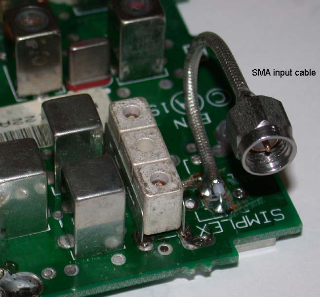 I wanted to use a SMA female connector for the receiver input. Since I had to remove the receiver board to replace the triple filter assemblies anyway it was decided to remove the "can" from the receiver board as well. This is the receiver input.