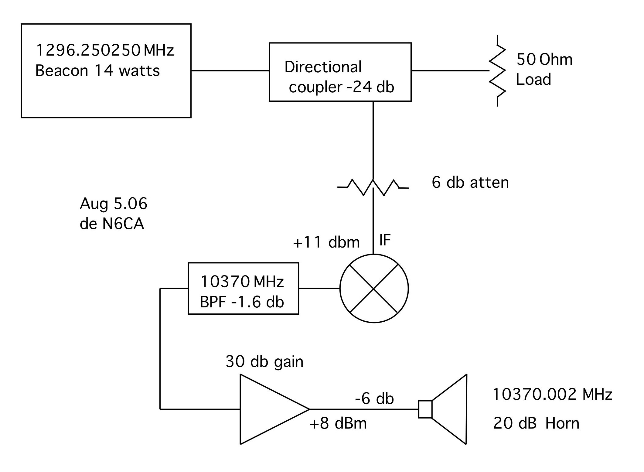 Temporary antenna spatial alignment beacon, placed at hotel in Hilo, HI. Signals were very strong with no trouble finding the beacon without being pointed at it. A 20 db attenuator was added to the beacon to reduce its amplitude to keep the test receiver out of saturation up on the volcano. Paul worked with Fred W6YM/KH6 and Chuck AH6SC to set up and run this test. Chuck was the Hilo hotel end of the test. It is the final test in preparation to the KH6 to W6 xband attempt and is for the purpose of eliminating the last variable over which we have control from the path. Beam headings are 68.5 Az and -3.27 EL degrees to the hotel and 59.1 degrees to W6 land.