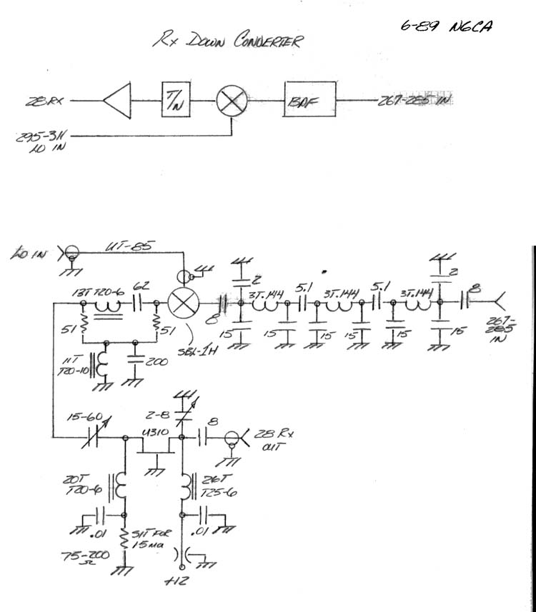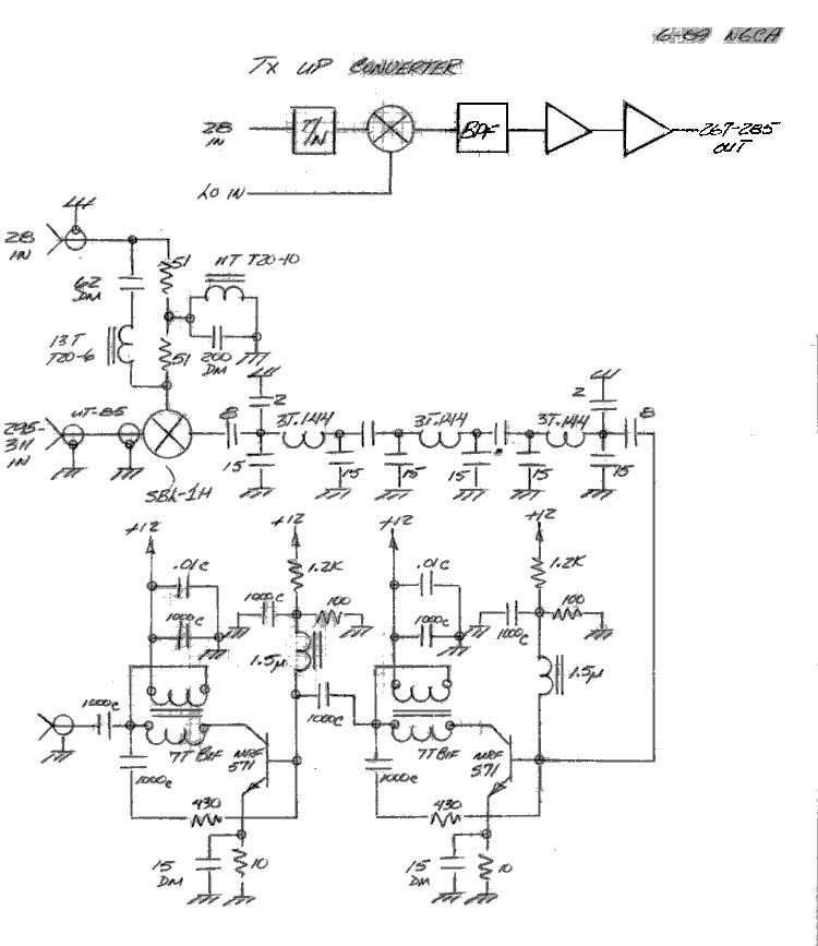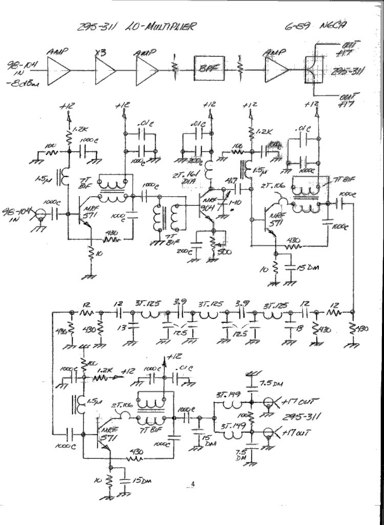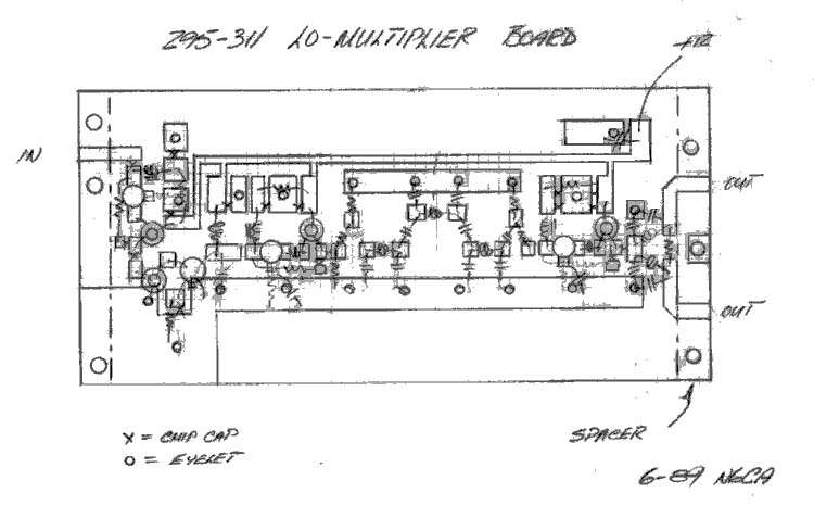 The freq-west source runs as normal. The 100 MHz oscillator test point is used to drive a LO/Multiplier board. The 100 MHz signal is attenuated, buffered, tripled to 300 MHz, filtered and amplified to drive the first I.F. Up/Down converters. This frequency scheme was chosen on the basis of spectral purity; there is very little RF from 267 to 283 MHz, generally. Adequate first I.F. and microwave L.O. separation are also provided. Simple filters provide good second I.F. filtering (28 MHz) and LO (295-311 MHz) and image attenuation.